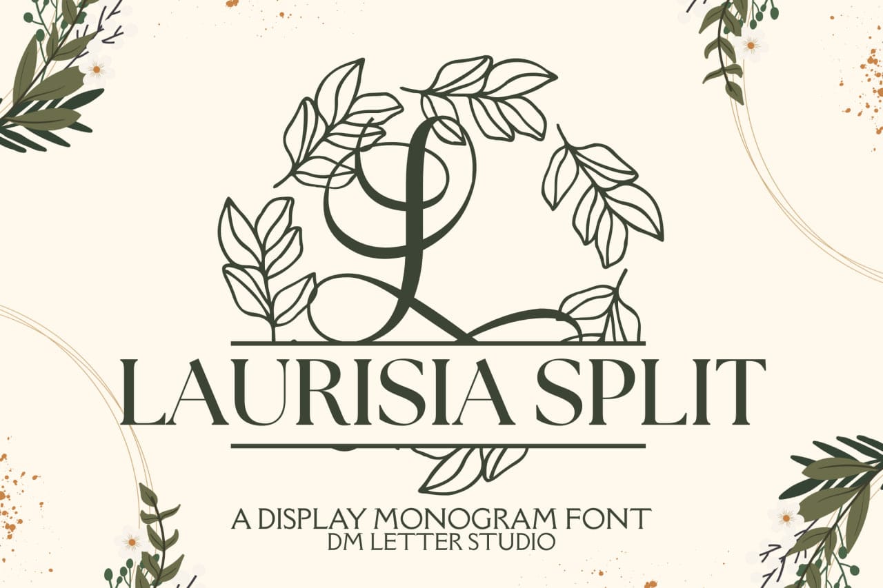 Start with a bold split initial, then place a name, family title, or date across the center bar. After that, add supporting text in a soft serif or a neat humanist sans. Because Laurisia Split holds shape at small sizes, cards, cartons, acrylic signs, and tags print cleanly and cut smoothly. In addition, the proportions pair beautifully with wreath frames, laurel rings, oval borders, and thin dividers, so full sets come together in minutes. Finally, save palette pairs like sage & ivory, champagne & charcoal, navy & pearl, or cocoa & cream to repeat across your product line.