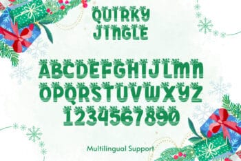 Quirky Jingle Font wraps your words in cozy, fun holiday energy. Letters feel bold and rounded. Details hint at bells, ribbons, and carols. Because the shapes stay thick and clear, your message reads fast on screens and in print. Use it for Christmas shirts, tags, cards, mugs, and festive social posts. Moreover, it looks great on both light and dark backgrounds, so you can swap themes with ease.