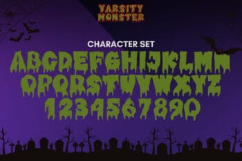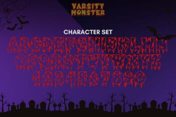 The varsity Monster font mixes classic college shapes with playful monster energy. Letters look bold, rounded, and a little wild. Because strokes stay thick, your words read fast on shirts, stickers, and thumbnails. Use it for team merch, Halloween pep events, game-day banners, and YouTube covers. Moreover, the style loves color, outline, and texture, so even simple mockups feel lively.